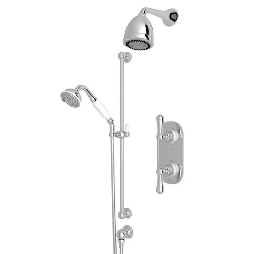 Perrin and Rowe Georgian Era thermostatic shower kit includes: U.8585LS 1/2″ Therm Trim; U.5800 6-Function Showerhead; H08000 7″ Shower Arm; U.5387 Handshower and 58″ Hose; U.5540 24″ Slide Rail; U.5546 Wall Outlet for Hose; To complete package, you must order rough: R1050BD Thermostatic Rough.